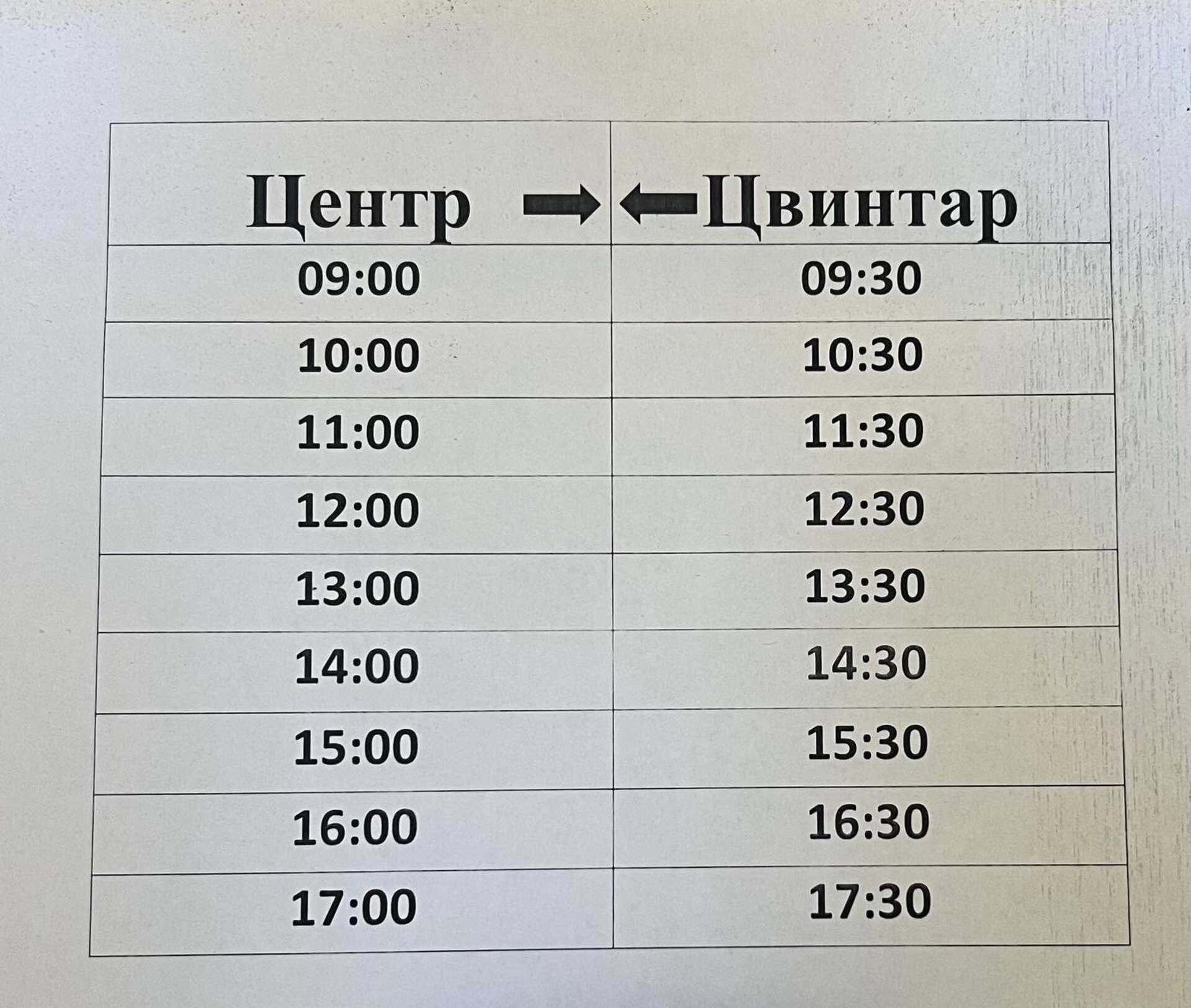 Автобус відправлятиметься з центру щогодини, починаючи з 09:00 та курсуватиме до 17:00. У зворотньому напрямку відправлятиметься щогодини з 09:30 до 17:30.