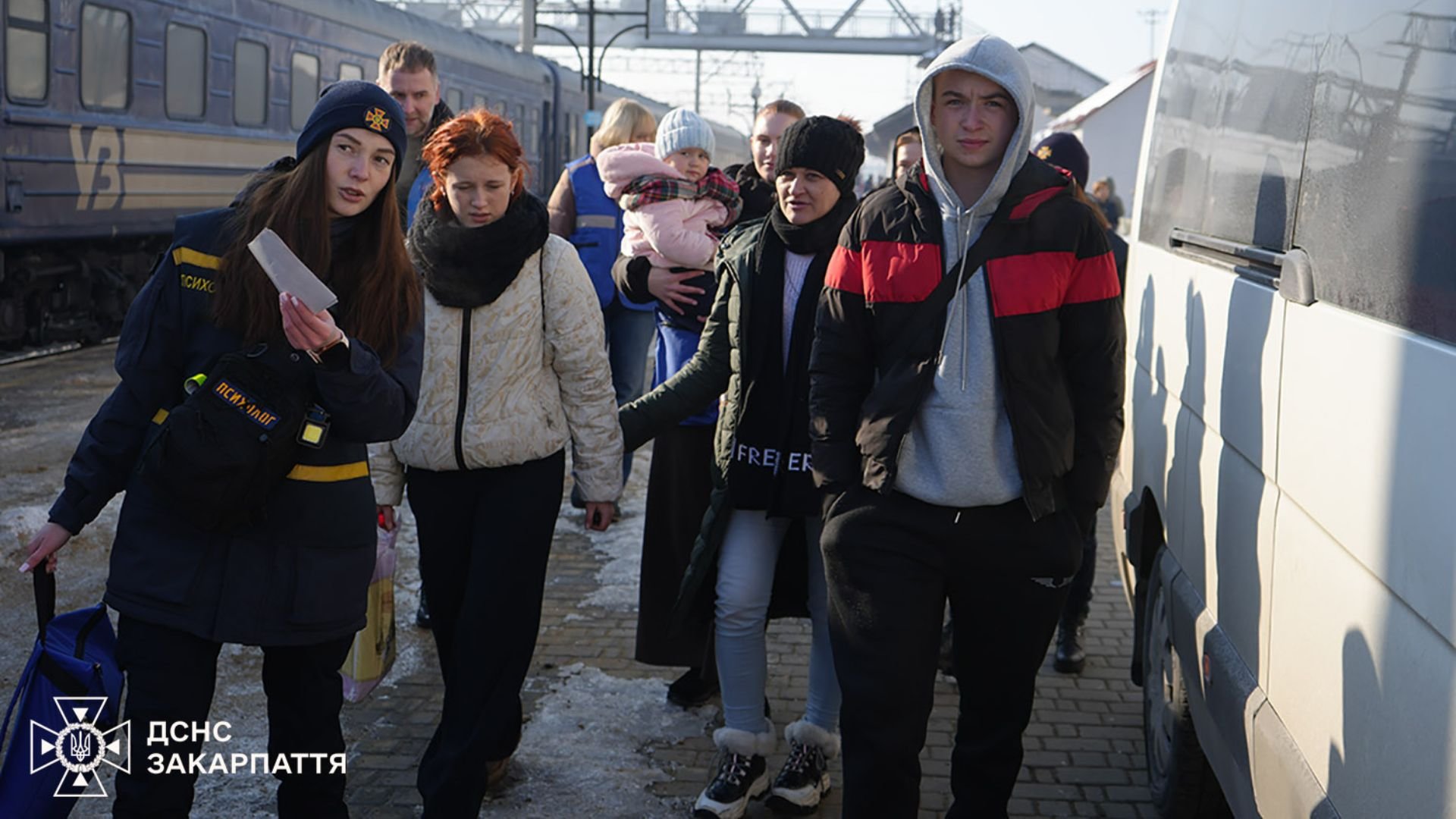 На залізничному вокзалі родини зустрічали рятувальники та психологи ДСНС, волонтери й медики. Вони допомогли з речами, надали першу підтримку та проконсультували щодо подальших дій.
