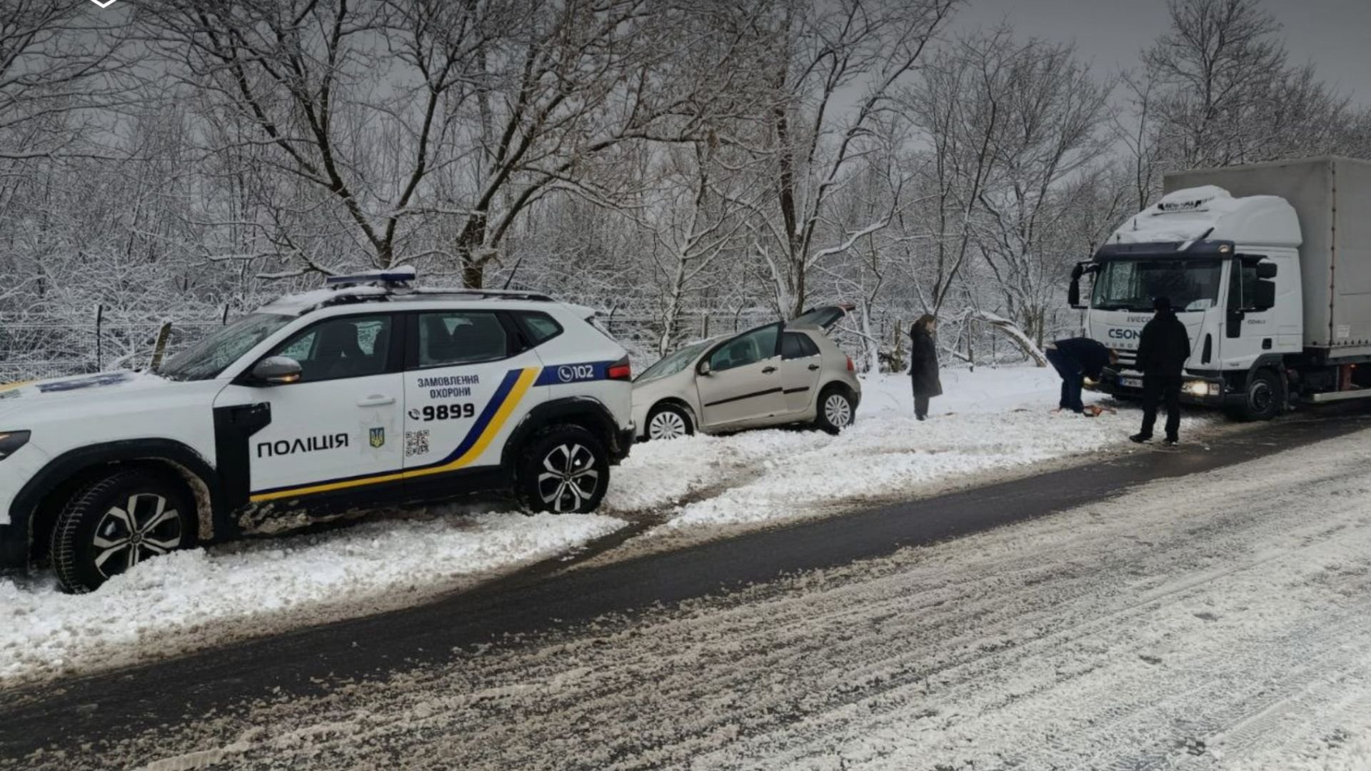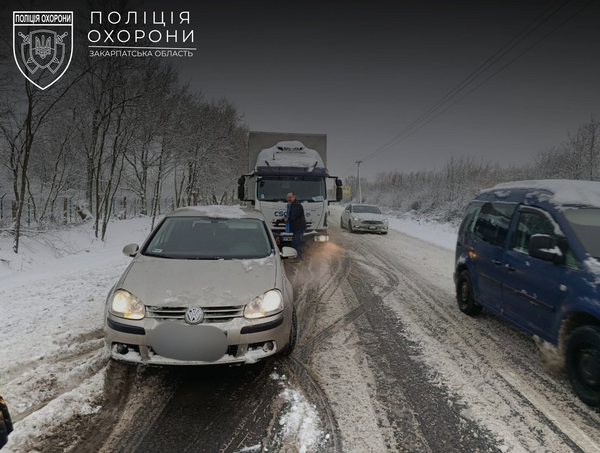 Через зимову негоду поліцейські Мукачівщини двічі оперативно прийшли на допомогу водіям: у селі Павшино поліцейські охорони разом із водієм вантажівки витягли легковик із кювету, а в Мукачеві патрульні допомогли витягти авто Mercedes зі снігової пастки — обидва водії не постраждали.
