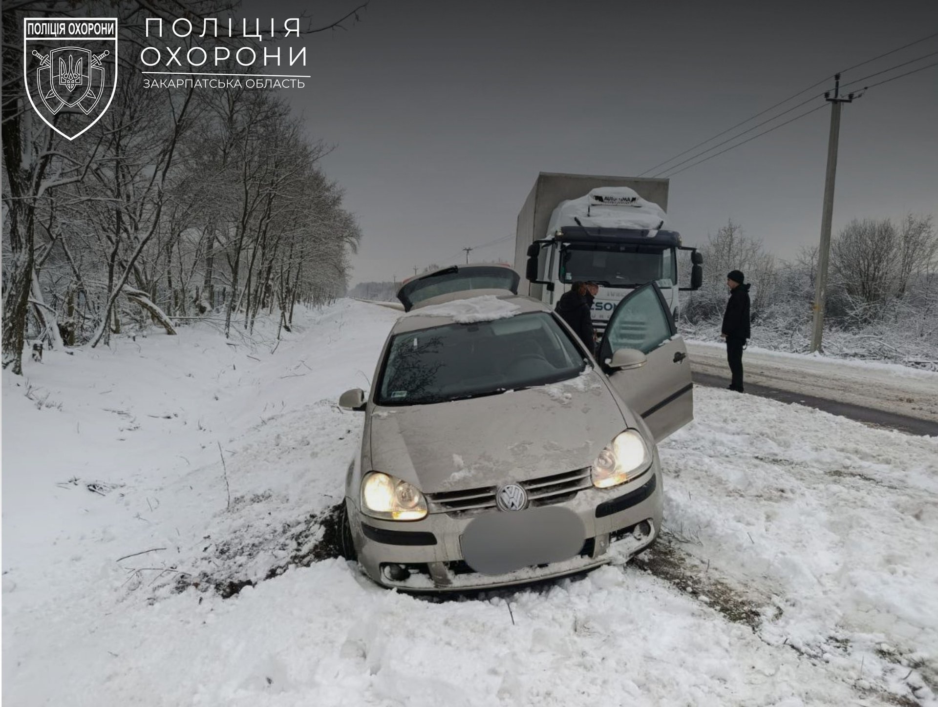 У селі Павшино Мукачівського району автомобіль жінки з’їхав у кювет. Поліцейські охорони, що патрулювали район, виявили автівку та звернулися по допомогу до водія вантажівки, який проїжджав повз.