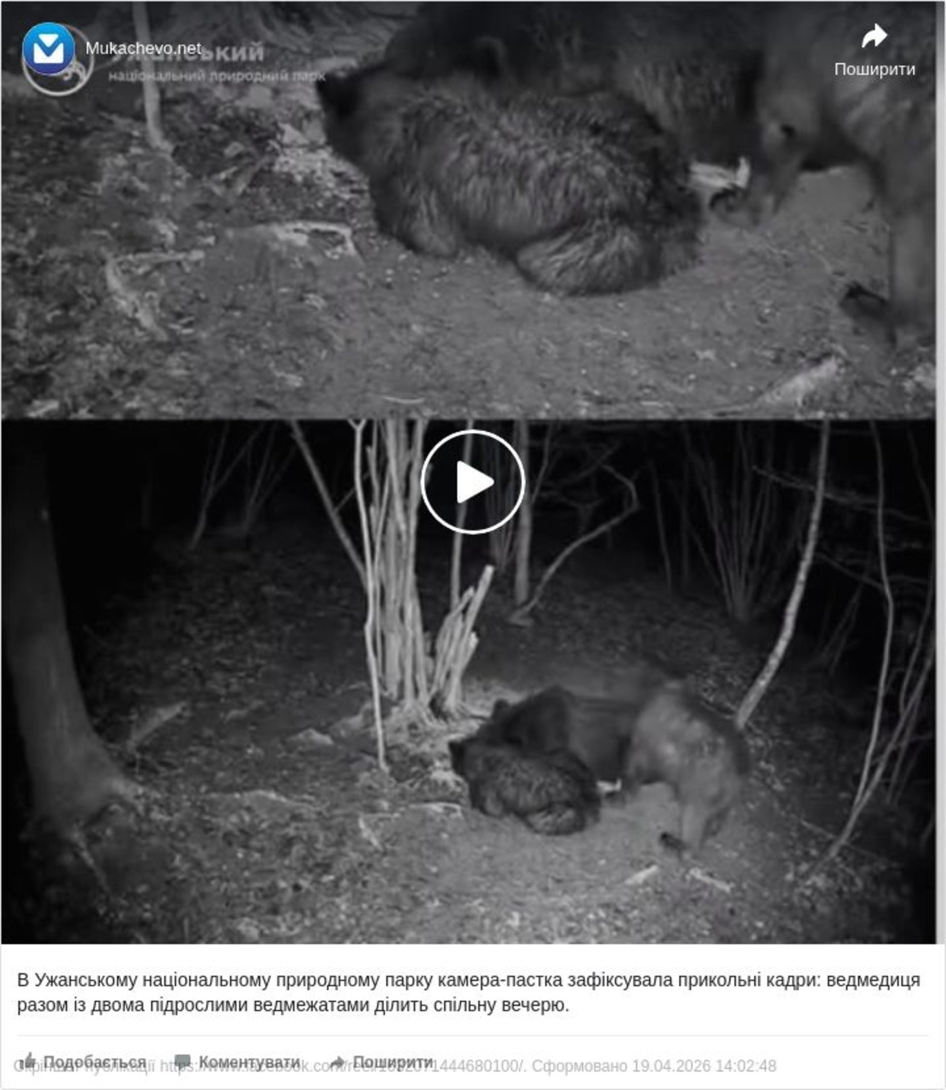 Камера-пастка в Ужанському національному природному парку записала зворушливу сцену з дикої природи - ведмедиця та двоє щонайменше дворічних ведмежат разом смакують знайдений корм, повідомляє Facebook-сторінка парку.