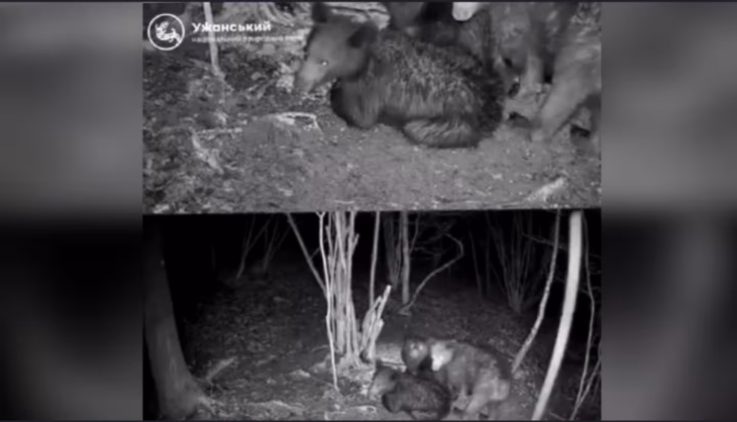 В Ужанському національному природному парку на Закарпатті камера-пастка зафіксувала рідкісні кадри: ведмедиця разом із двома підрослими ведмежатами ділить спільну вечерю.