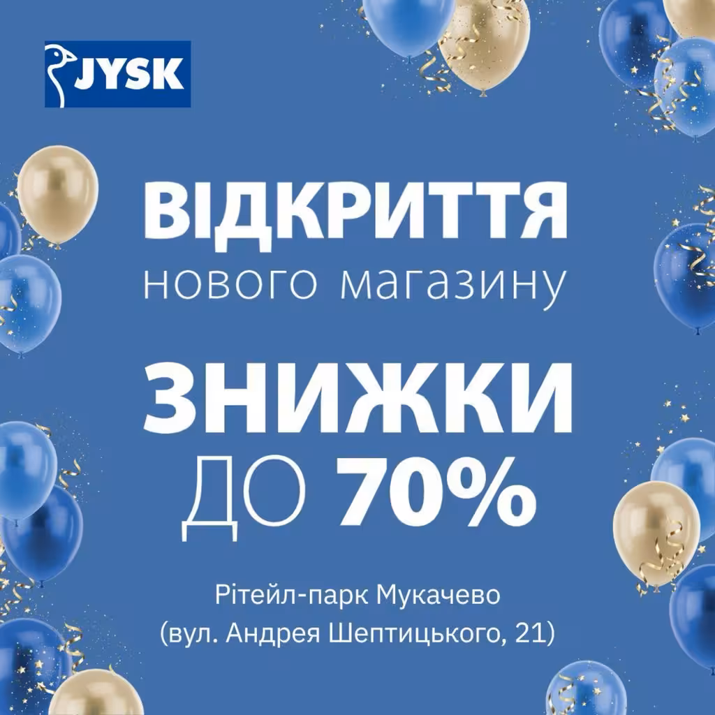 У Мукачеві відкриється перший магазин відомого скандинавського бренду JYSK. Офіційне відкриття відбудеться 18 грудня о 10:00 у Retail Park Mukachevo на вулиці Андрея Шептицького, 21.