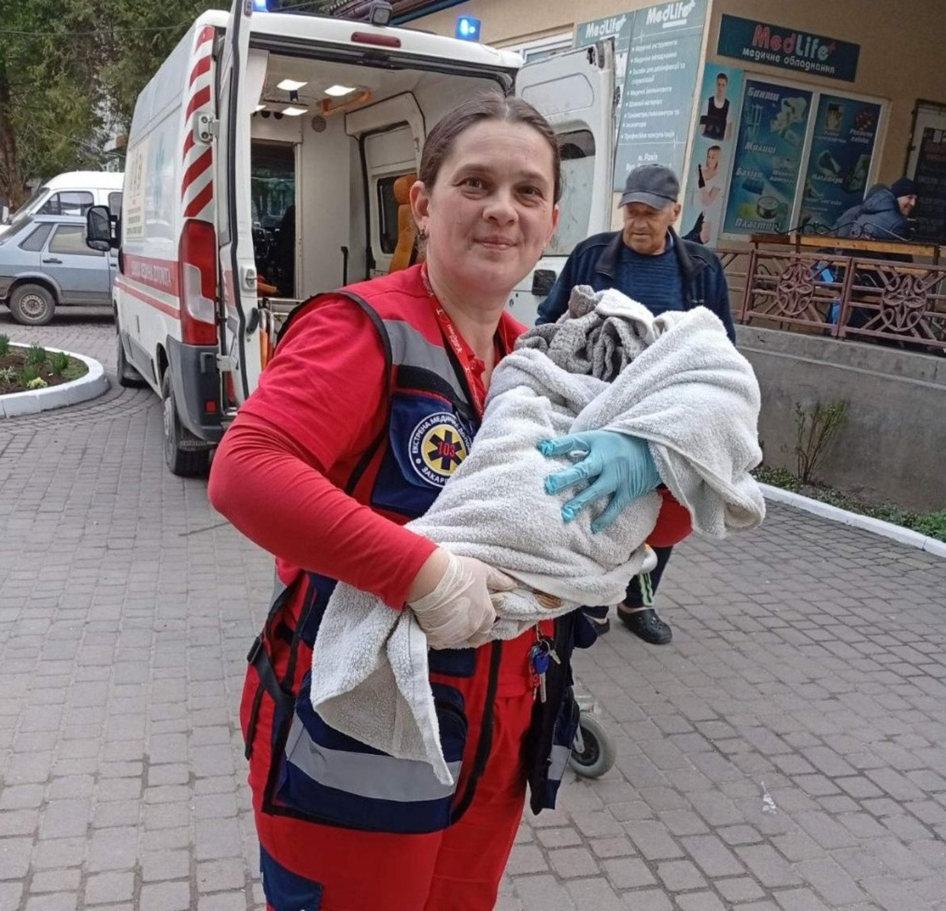 Бригада здійснила стандартні процедури: очистила дихальні шляхи немовляти, перевірила стан дитини за шкалою Апгар (8–9 балів) та підтвердила, що стан матері задовільний.