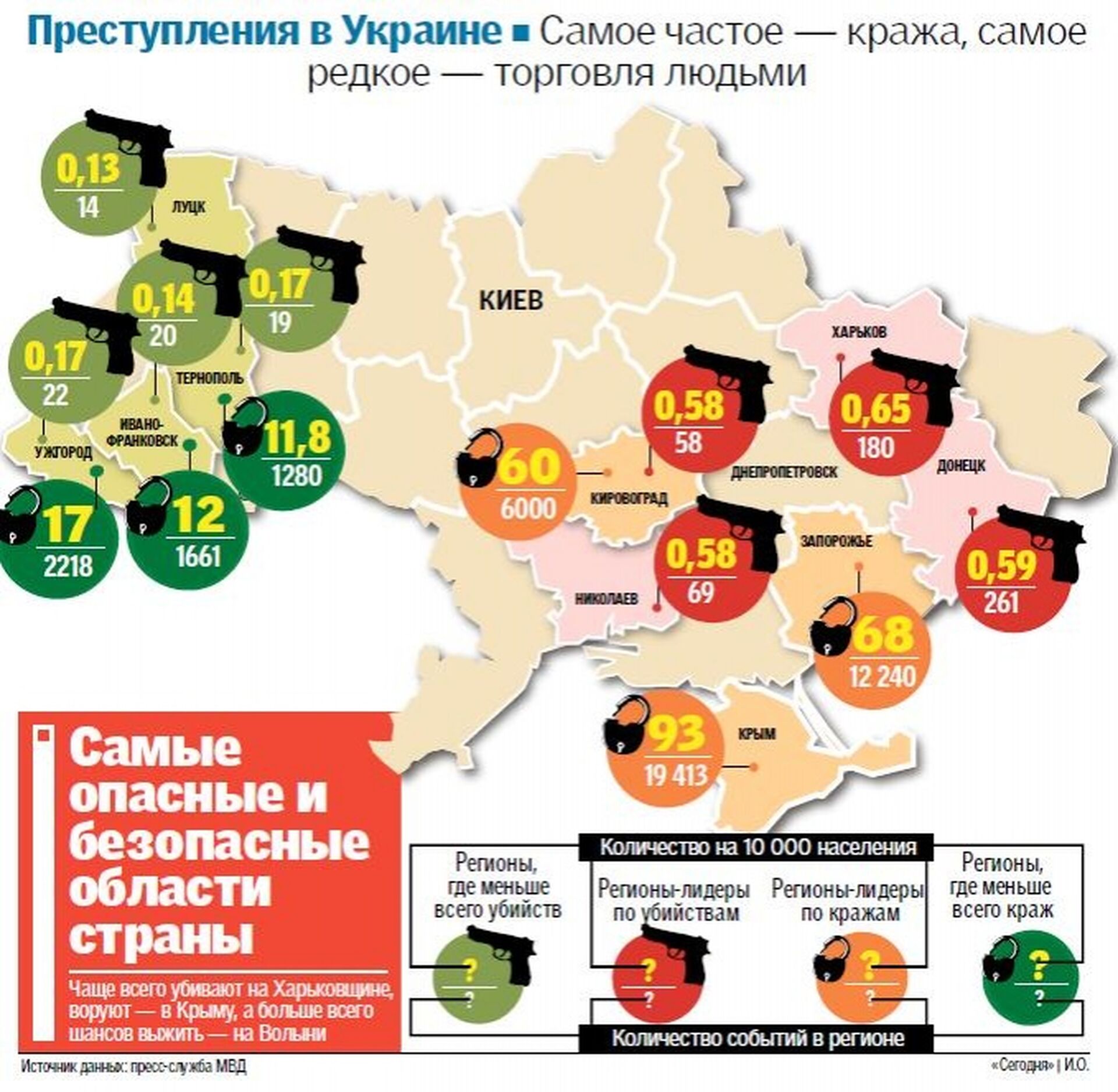 Найбезпечніше жити на Заході України. Так, найменше вбивств на душу населення (у перерахунку на 10 тис. чоловік) - на Волині, в Івано-Франківщині, Закарпатті та Тернопільщині. Лідери ж з убивств - Харківщина та Донецька область (див. нижче інфографіку).