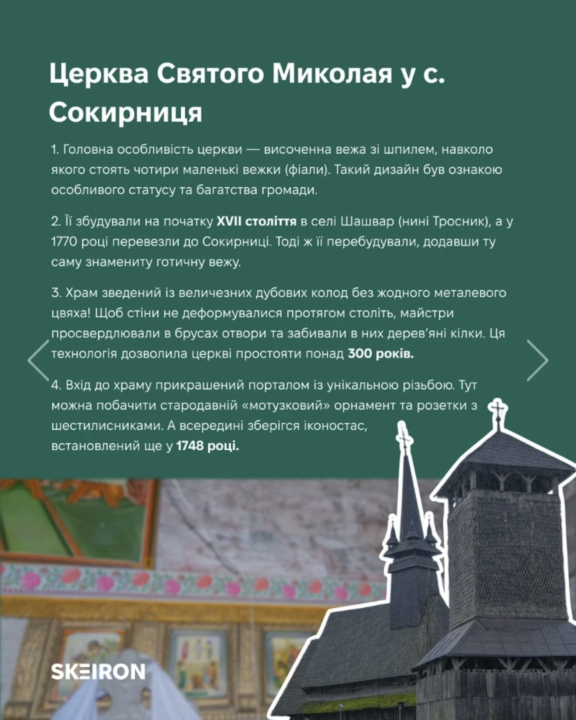 Також досліджують Миколаївську церкву у селі Сокирниця. Дерев’яний храм XVII століття має готичну вежу з високим шпилем. Його збудовано з дубових колод, а вхідний портал прикрашений давньою різьбою з «мотузковим» орнаментом і розетами-шестилистниками.