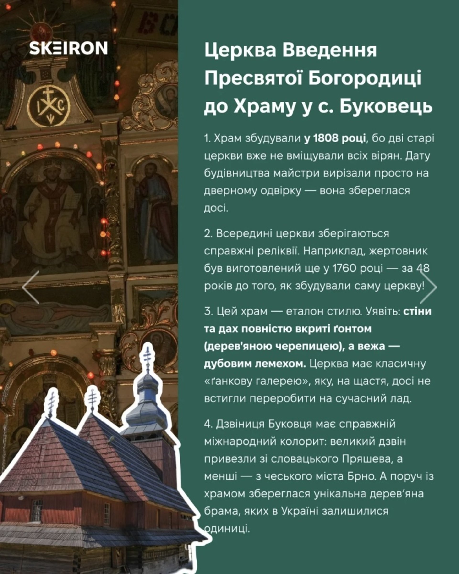 Також планують створити 3D-модель Церкви Введення в храм Пресвятої Богородиці із села Буковець. Храм XIX століття має повністю оббиті ґонтом стіни та дах, а також ґанкову галерею. Ще одна церква з такою ж посвятою — Церква Введення в храм Пресвятої Богородиці у селі Розтоки — також була перевезена. Усередині храму збереглася сцена Страшного суду, де художник зобразив корумпованих суддів, митників і п’яниць.