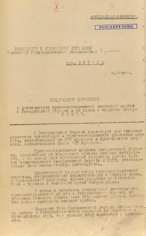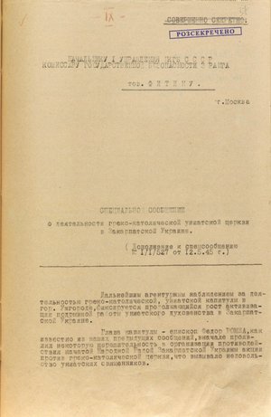 Навесні 1945 року перше управління нкдб урср підготувало кілька спеціальних повідомлень про діяльність греко-католицької церкви в Закарпатській Україні та її лідера єпископа Ромжу. Вони адресувалися першому секретарю цк кп(б)у Микиті Хрущову, керівникові радянської зовнішньої розвідки Павлу Фітіну і голові нкдб срср Всеволоду Меркулову. У документах йшлося про те, що на тлі підготовчих заходів із приєднання Закарпаття до радянської України греко-католицька церква активізувала свою антирадянську діяльність. У розвиток цієї тези зазначалося, що тамтешній єпископ Ромжа відмовився підписати «Маніфест про возз’єднання Закарпаття з радянською Україною» і заявляв, що «існуюча влада не від Бога, вона скоро розпадеться».