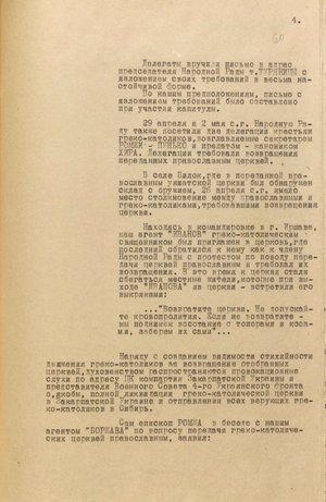 Далі з тексту документа стає зрозуміло, чому єпископ Ромжа так негативно відреагував на запровадження нової політики на Закарпатській Україні. Коли у жовтні 1944 року на цю територію прийшла червона армія, там діяли понад 400 греко-католицьких парафій і близько 100 православних (в оперативних документах нкдб фігурують інші цифри – близько 300 і понад 100). Тамтешня Мукачівська греко-католицька єпархія безпосередньо підпорядковувалася Ватикану. Радянське керівництво не могло такого допустити. Тож давалися вказівки, щоб схиляти католицьких священників до відмови від вірності Риму, переходу в православ’я, розпалювали міжконфесійні суперечки, відбирали церковні землі. То були лише перші пробні кроки на шляху до цілковитого знищення греко-католицької церкви на Закарпатті. Остаточні заходи були здійснені вже після Львівського псевдособору.