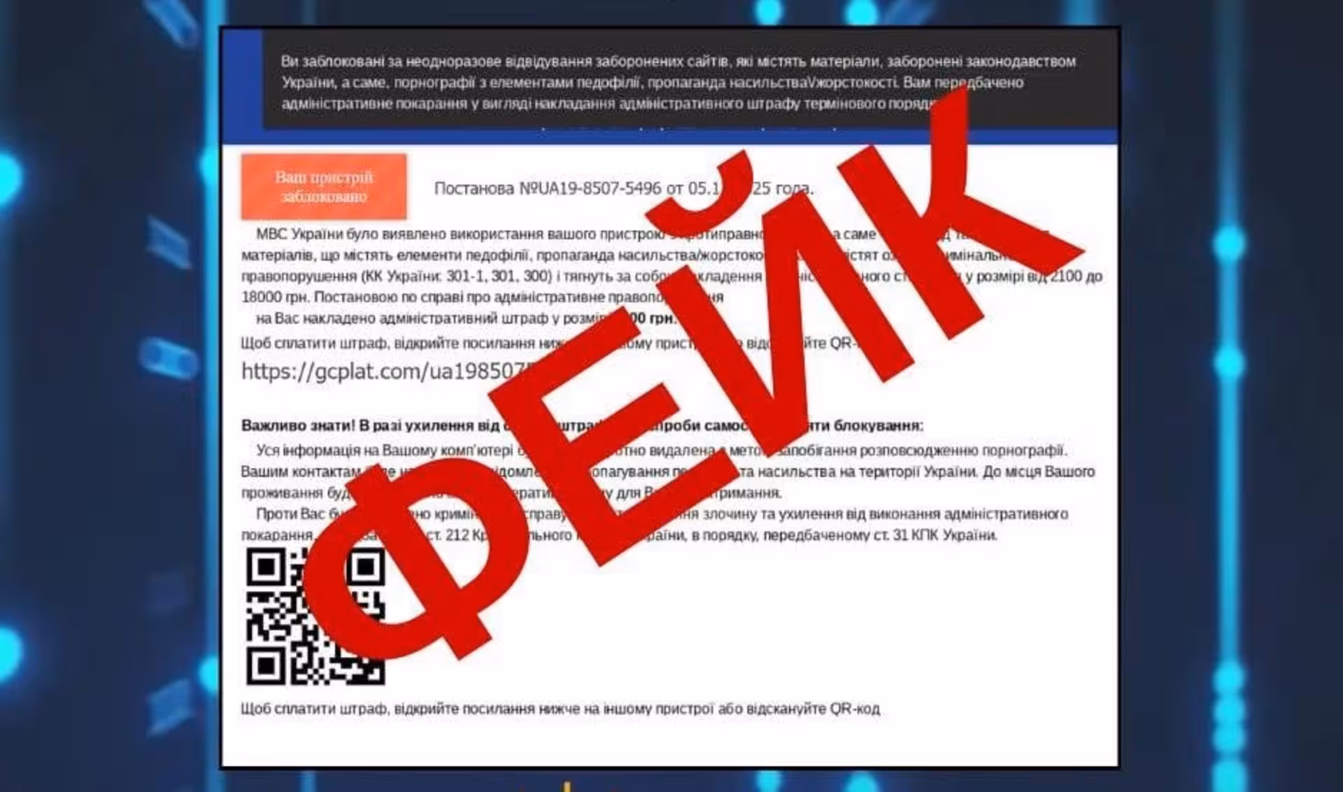 У таких повідомленнях людей закликають перейти за посиланням або QR-кодом для сплати «штрафу».