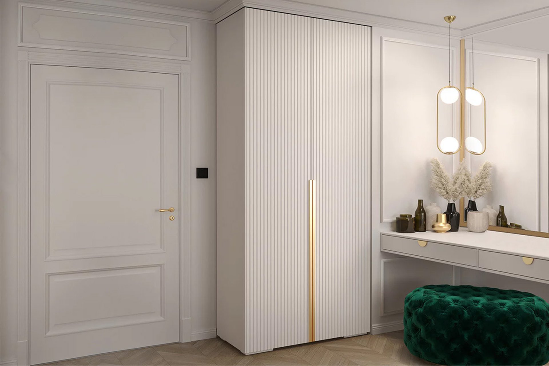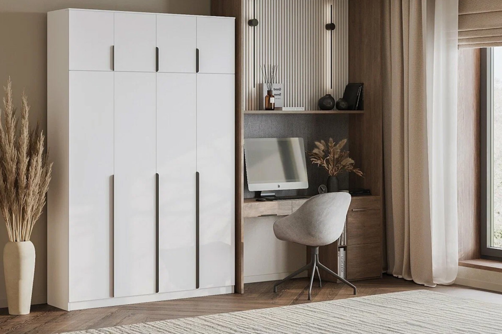 Коли кімната дозволяє залишити вільну зону перед меблями, відкривання не створює труднощів. Особливо це зручно, якщо всередині багато полиць і важливо швидко бачити всі речі одночасно. У просторішій спальні такий формат може бути практичнішим.