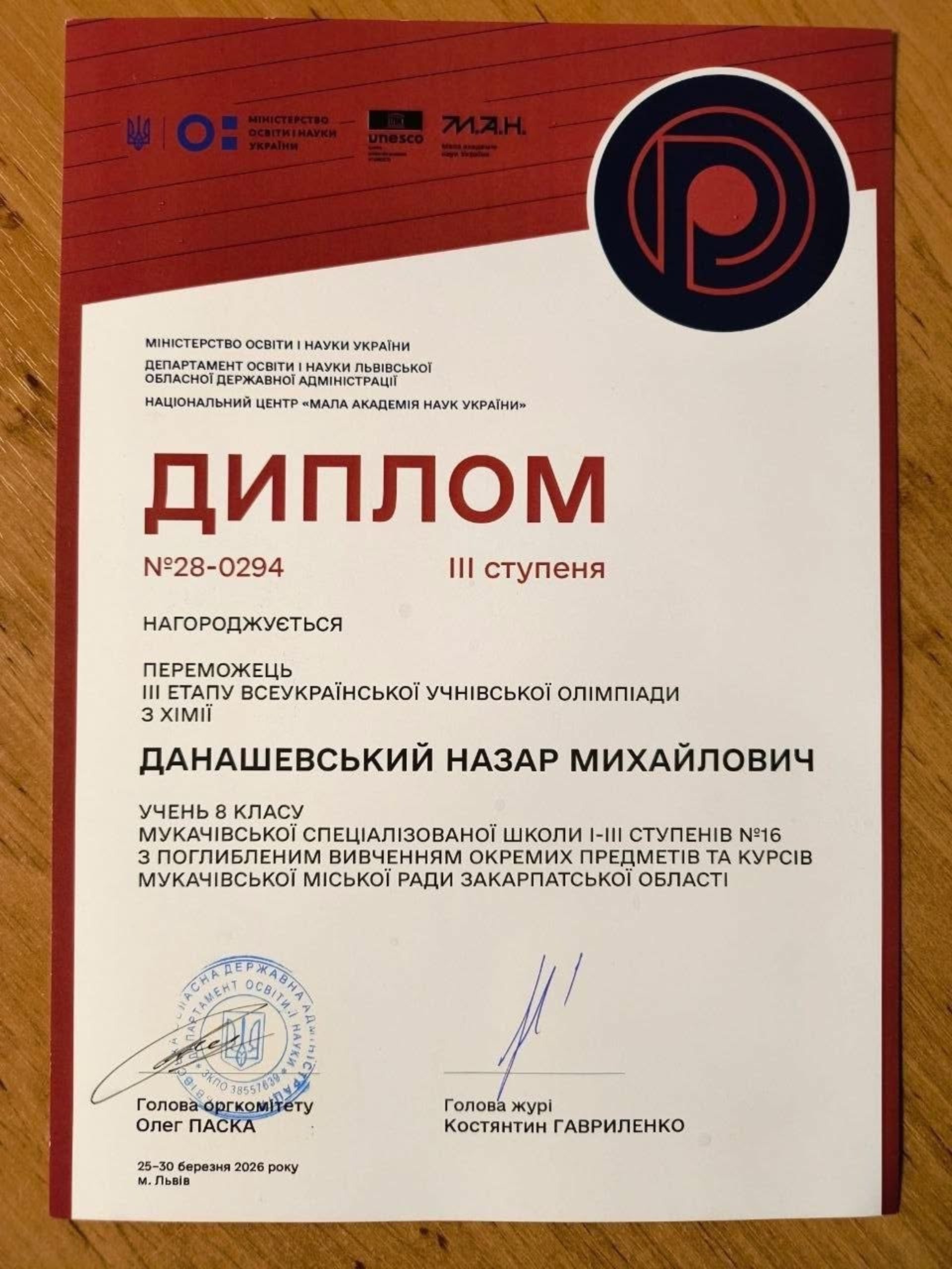 Школяр навчається у 8-А класі Мукачівської спеціалізованої школи №16. Всеукраїнська олімпіада проходила у Львові з 25 по 30 березня та об’єднала найсильніших юних знавців предмета з різних регіонів України.