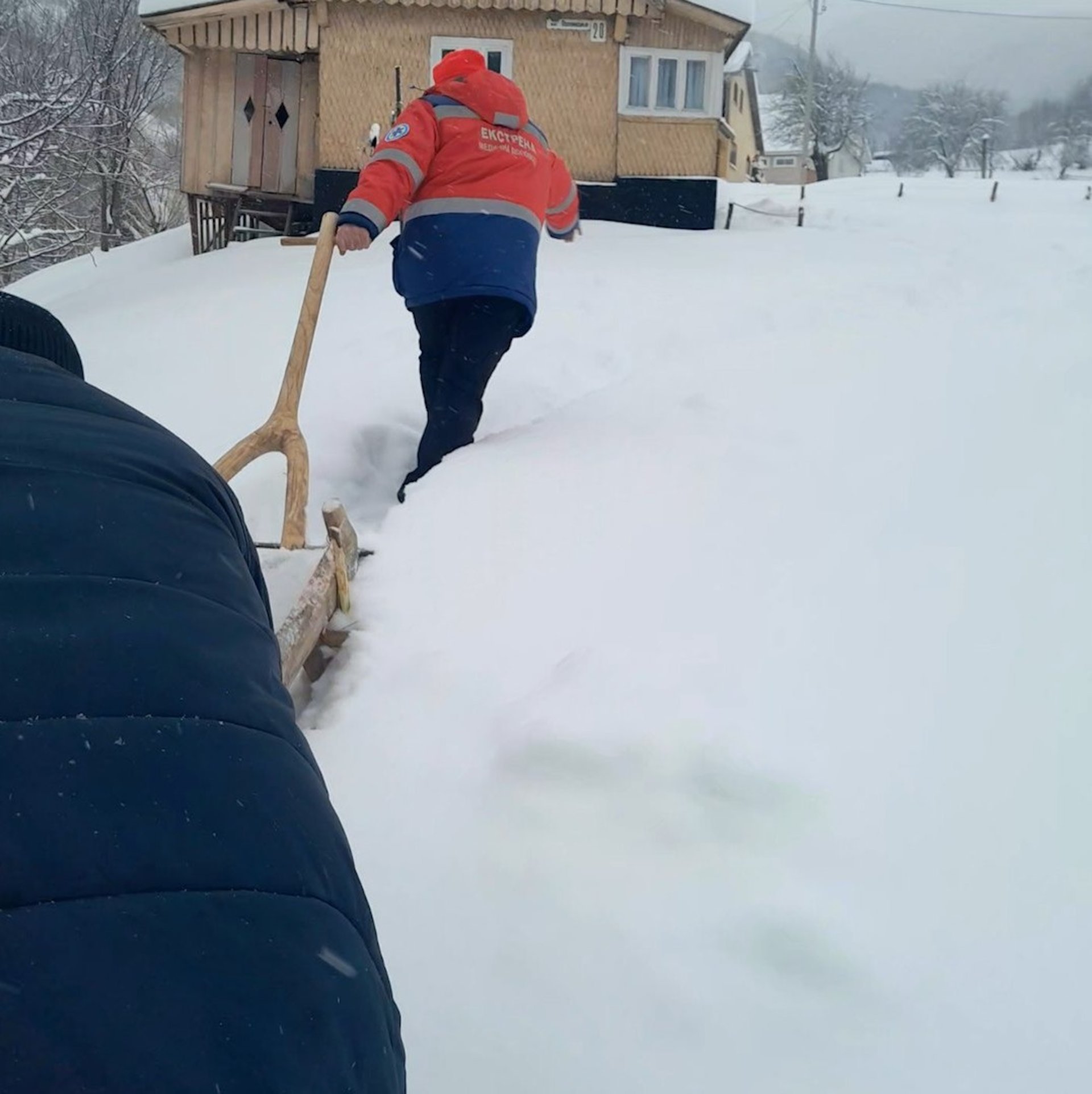 Виклик надійшов до служби екстреної допомоги, після чого на місце негайно вирушила бригада. Через складні погодні умови та засніжену дорогу дістатися до оселі пацієнта автомобілем було неможливо, тож останні сотні метрів медики долали пішки.