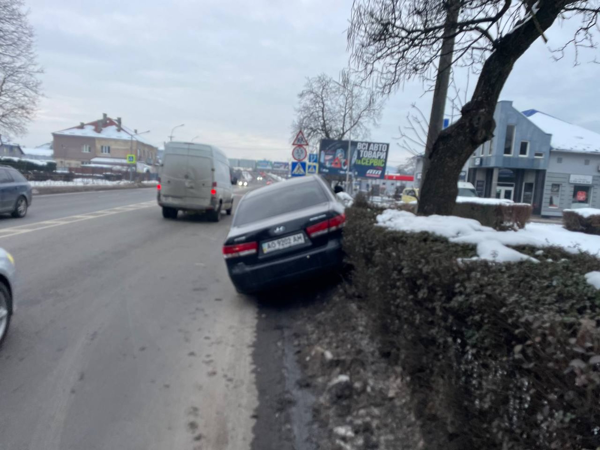 Причини події наразі невідомі: чи це дорожньо-транспортна пригода, чи водій невдало припаркувався — офіційної інформації поки немає. На місці не було помітно екстрених служб.
