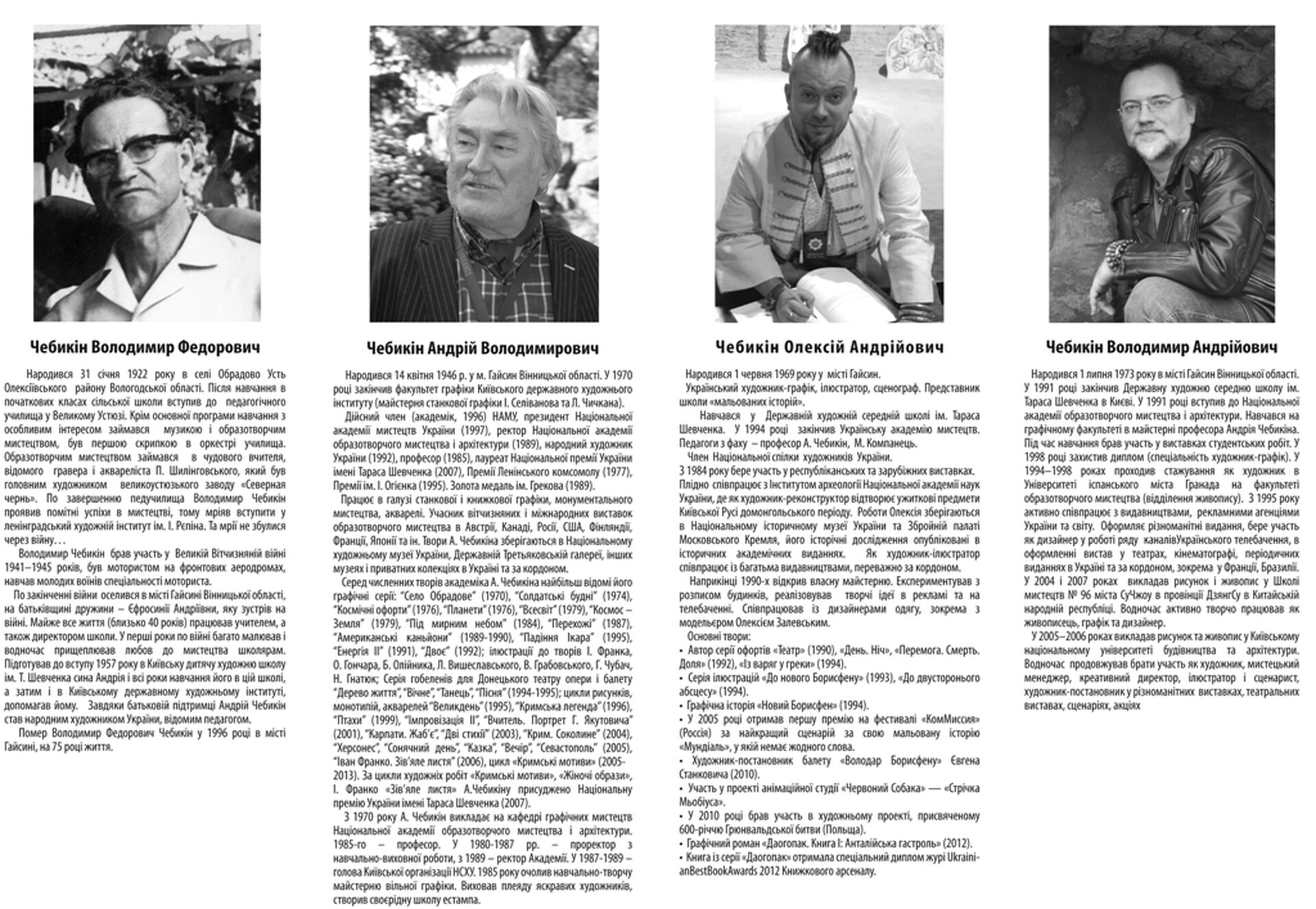 На виставці будуть представлені роботи Чебикіна Андрія Володимировича, його батька Чебикіна Володимира Федоровича та його синів Олексія та Володимира.