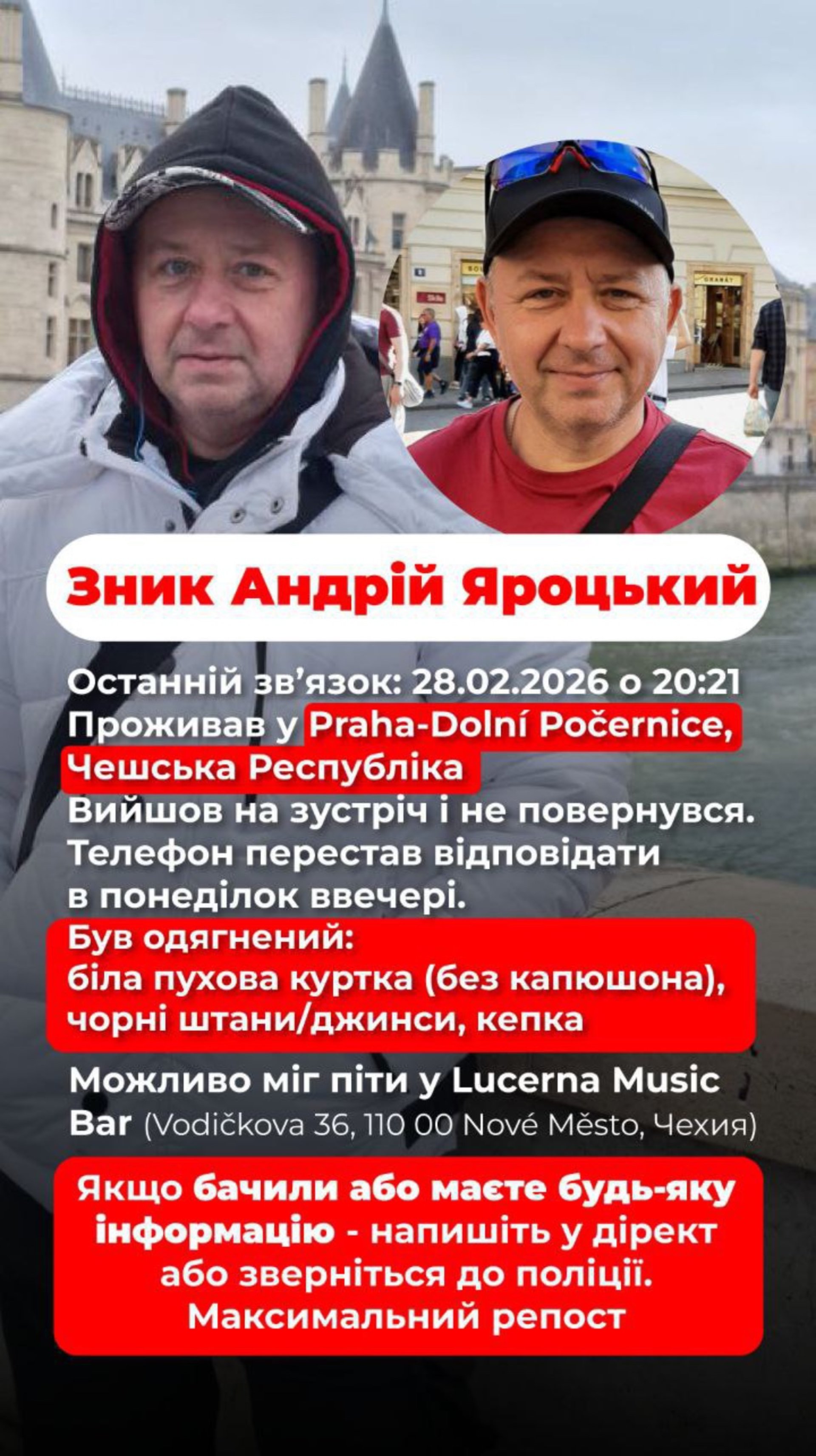 У Празі безвісти зник 57-річний громадянин України Андрій Яроцький. Сім'я звертається з проханням про допомогу. Поліція також веде пошуки зниклого.