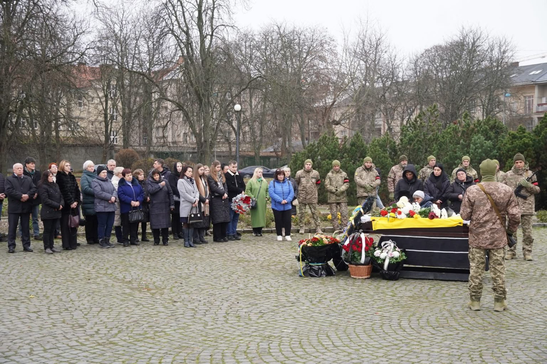 Родина, друзі, знайомі та побратими прийшли на площу Народну, аби віддати шану воїну. Військовослужбовець помер 22 листопада 2025 року.