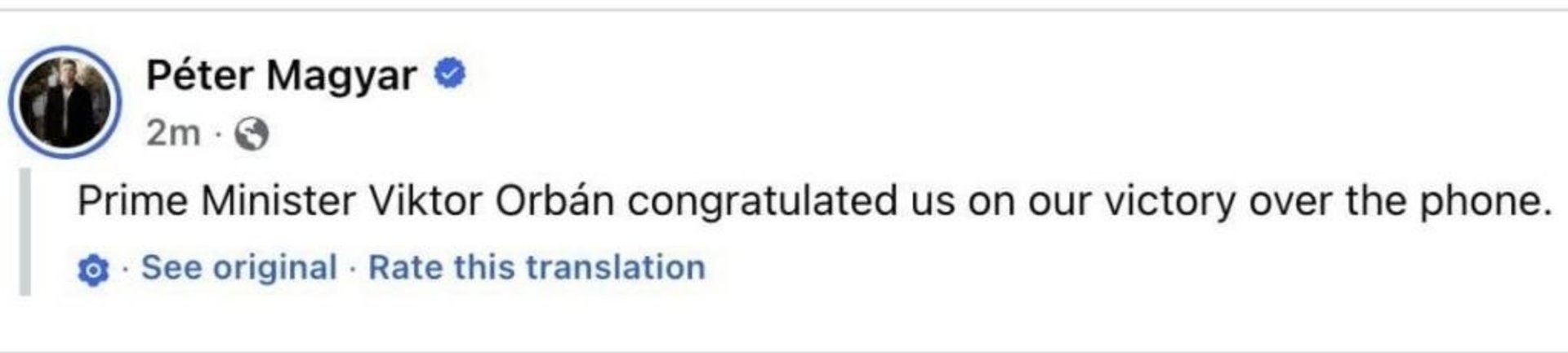 Прем’єр-міністр Угорщини Віктор Орбан вже зателефонував опозиційному політику Петеру Мадяру та привітав його з перемогою. Про це сам Мадяр повідомив у соцмережах.