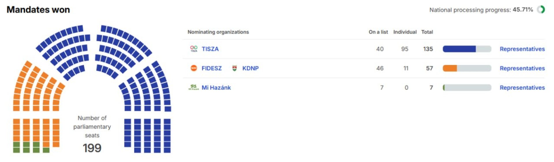 Загалом парламент Угорщини налічує 199 депутатів. Наразі, за попереднім розподілом, партія влади Fidesz разом із союзниками суттєво відстає від опозиції.