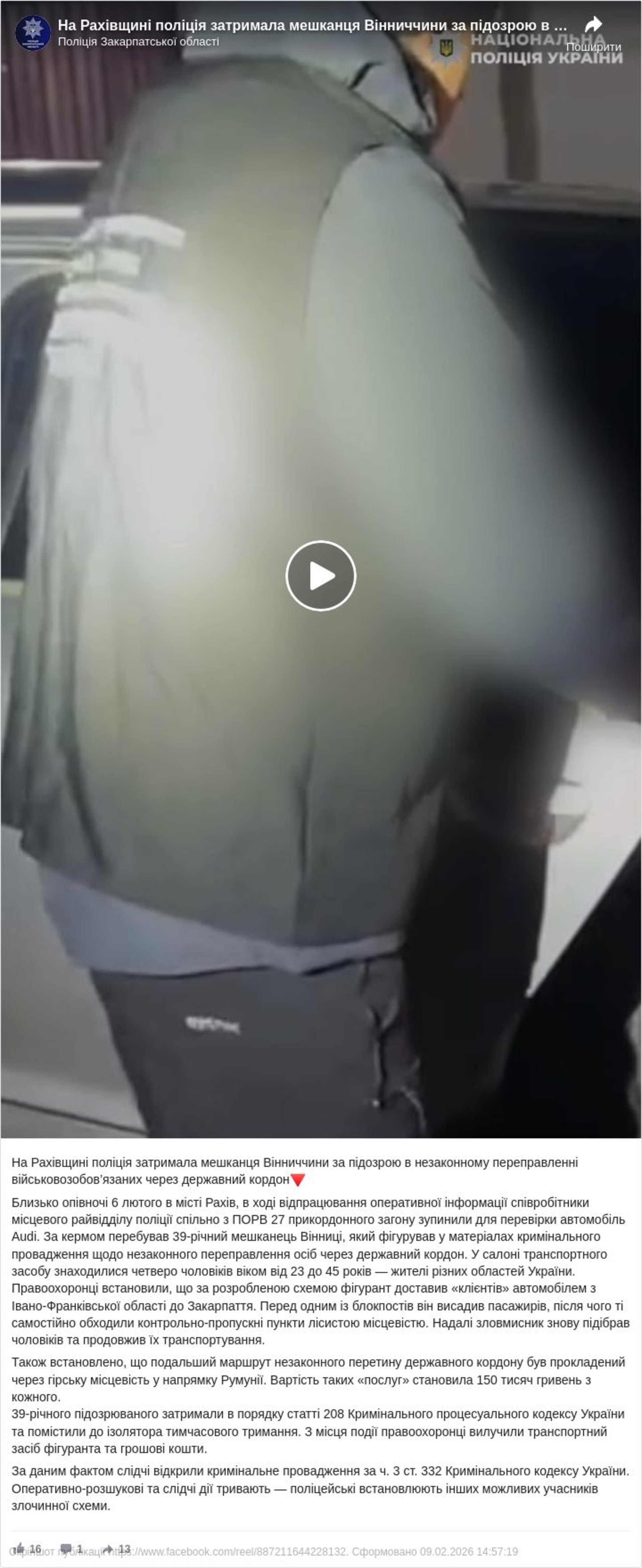 Водія правоохоронці затримали у порядку та повідомили про підозру у вчиненні злочину передбаченого ст. 3 ст. 332 ККУ.