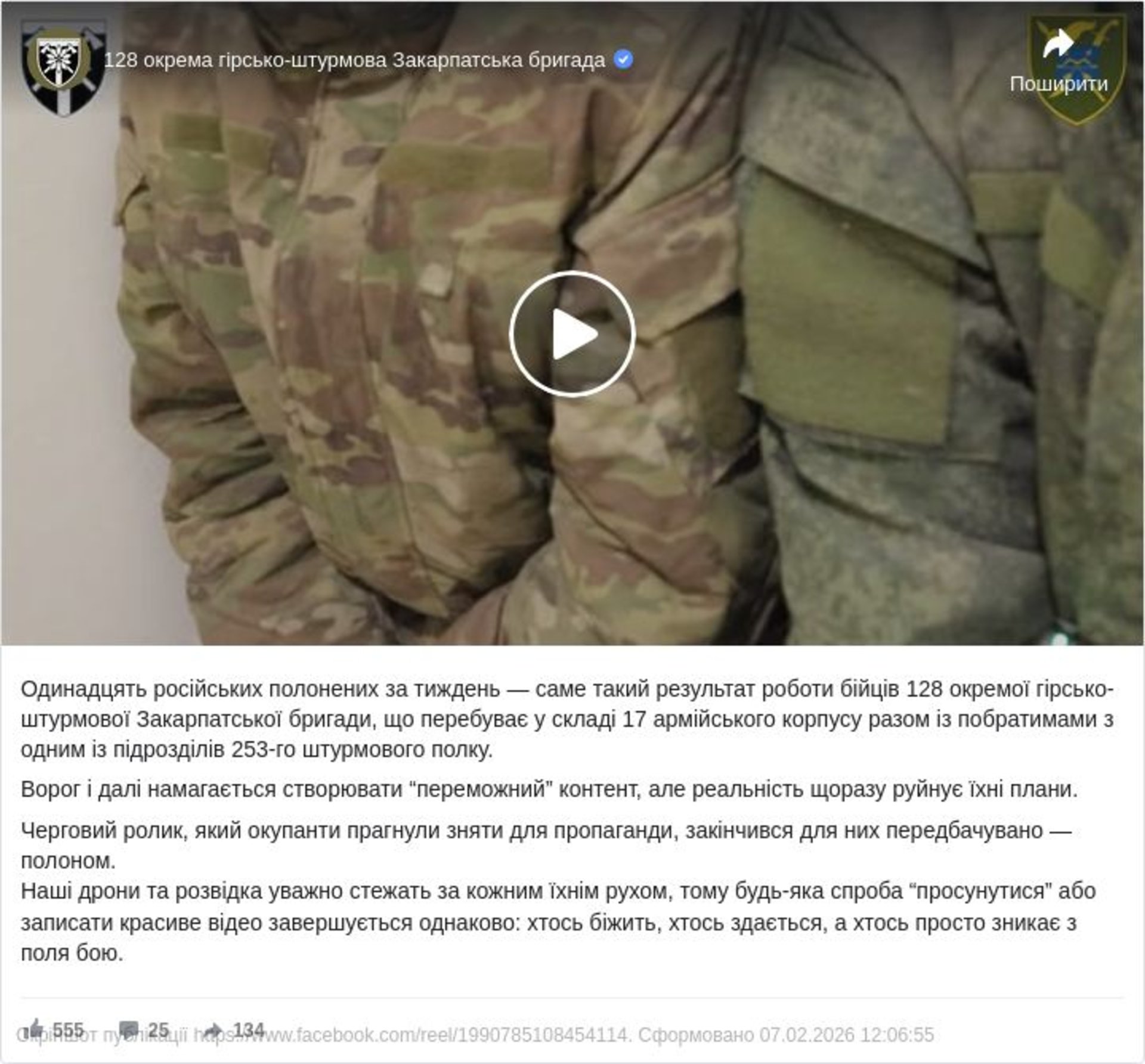 Одинадцять російських полонених за тиждень — саме такий результат роботи бійців 128 окремої гірсько-штурмової Закарпатської бригади, що перебуває у складі 17 армійського корпусу разом із побратимами з одним із підрозділів 253-го штурмового полку.