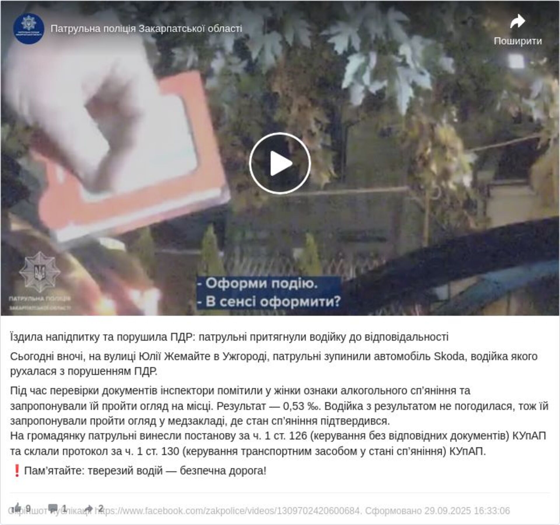 На водійку склали постанову за ч. 1 ст. 126 КУпАП (керування без відповідних документів) та протокол за ч. 1 ст. 130 КУпАП (керування транспортним засобом у стані сп’яніння).